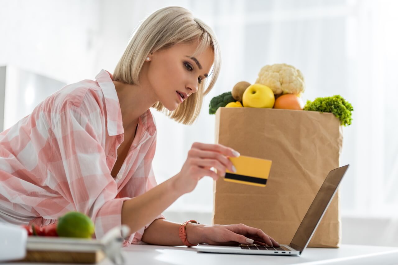 A woman in the kitchen with groceries on the counter.